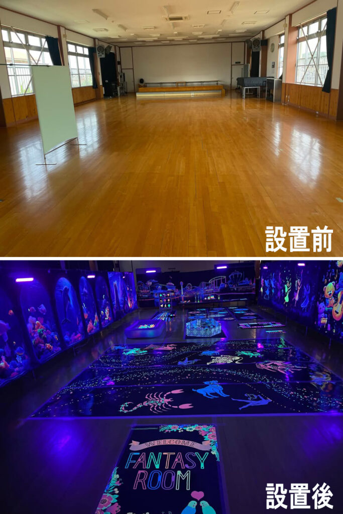 ブラックライトで発光する非日常空間です。蛍光色に発光する壁画シートやおもちゃなどは暗い空間でとても綺麗に発光するためお子さんの集中力が高まり、遊びながら感覚刺激を得られるリラックス空間に変化します。 初めての方でも設置・撤去が簡単です。