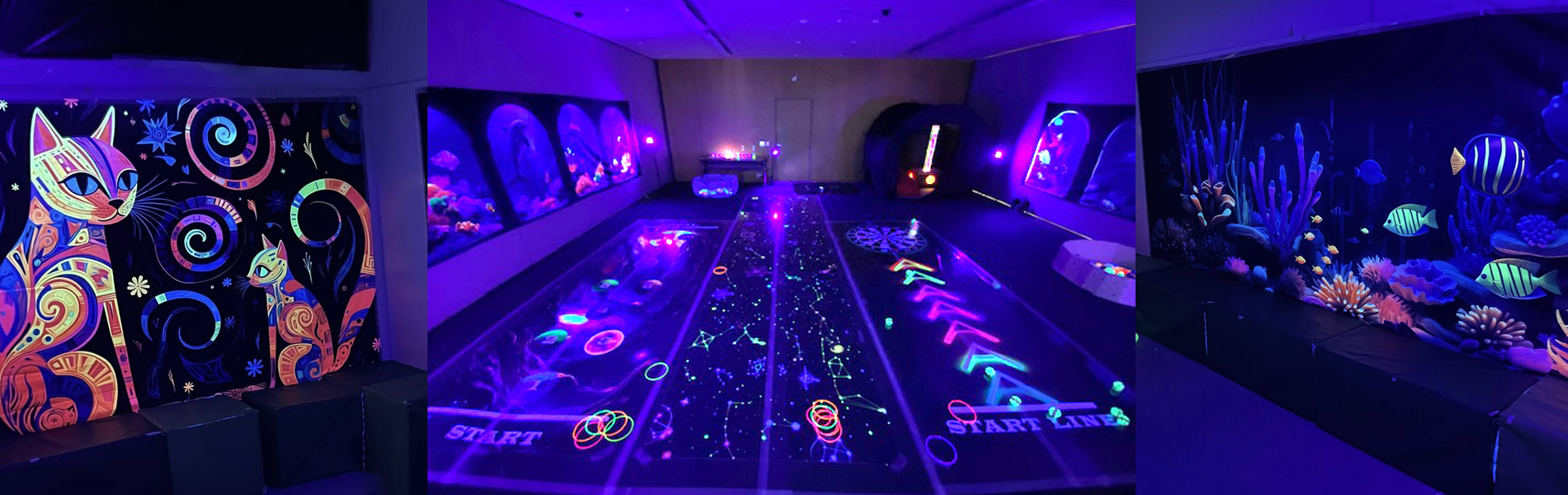 当会ではブラックライトで幻想的で美しい蛍光色に輝き視覚と脳を刺激する不思議なアートを制作しています。このアートを通じて障がいを持つ方々にもスヌーズレンブラックライトルームの非日常空間で心身ともに癒されながら楽しさや感動を是非体験していただくことを目的にスヌーズレンブラックライトルームの普及に取り組んでいます。